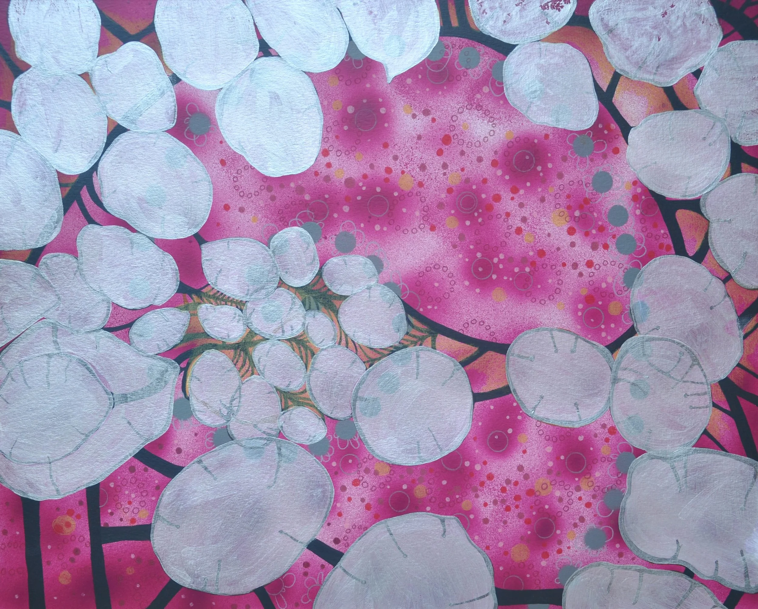 As we wander the mysterious depths of each painting, the flat patterns and transparent colors pull us in, challenging our perception of scale. Are we viewing a cavernous space like a camera's wide shot, an extreme close up, or are we exploring beyond our vision's capabilities? Night Watching provides a sense of looking out into the darkness of the universe, while the cell-like forms in Lunaria shift one's focus to a more intimate viewpoint.